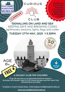We’ll start at the museum using models, handling objects and engaging with a talk by our Chairman, Roger Barrett. Then, we’ll be venturing over Cliff House gardens and Salcombe Yacht Club to try out some of these methods, through games. We’ll be working in teams to send each other safety messages, distress signals and break some TOP SECRET codes.